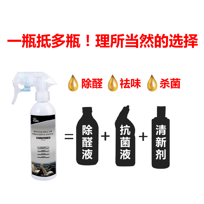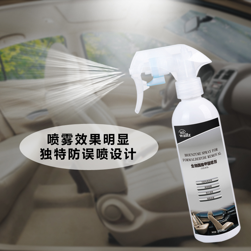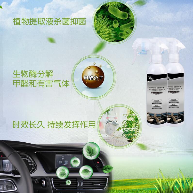 wallz 汽車除甲醛噴劑,利用除甲醛專用生物酶及植物提取液,降解甲醛分子,使之生成無毒害的物質,擁有24小時長效保護,時效可長達30天,安全無毒,無刺激性氣味,無腐蝕性,能持續殺滅98%以上的細菌和清除90%以上的甲醛異味,防止交叉感染,本產品只含有純天然生物活性物質,高效除醛,持久祛味,綠色環保,母嬰安全,是保持您車內環境干凈清新的最佳選擇。